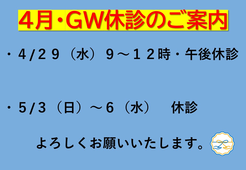 4月・GW休診のご案内 タンジール病 みなさんこんにちは。内藤です。 4月・GW休診のご案内 ・4/29(水曜)9~12時、午後休診 ・4/30(木曜)~5/2(土曜)通常診療 ・5/3(日曜)~5/6(水曜)午前、午後休診 よろしくお願いします☆ ☆★☆★☆★☆★☆★☆★☆★☆★☆★☆★☆★☆★☆★☆★☆★☆★☆★☆★☆★☆★☆★☆★☆★☆★ お身体のことでお困りの方、疲れている方は内藤接骨院までお気軽にお越しください!しっかりサポートさせて頂きます! 内藤接骨院 内藤