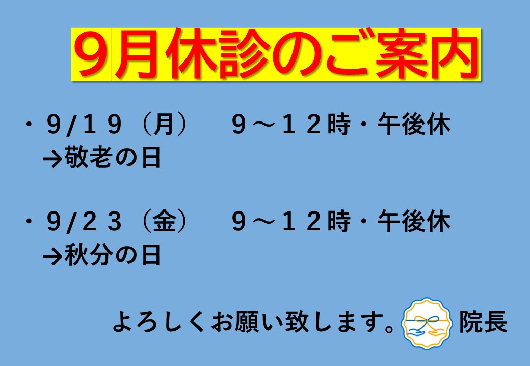 9月休診のご案内 タンジール病 みなさんこんにちは内藤です。 ・9/19(月曜) 9~12時、午後休診 →敬老の日 ・9/23(金曜) 9~12時、午後休診 →秋分の日 となります。よろしくお願いします。 ☆★☆★☆★☆★☆★☆★☆★☆★☆★☆★☆★☆★☆★☆★☆★☆★☆★☆★☆★☆★☆★☆★ お身体のことでお困りの方、疲れている方は内藤接骨院までお気軽にお越しください!しっかりサポートさせて頂きます! 内藤接骨院 内藤